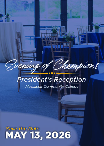 Please save the date for our Evening of Champions President’s Reception at Massasoit Community College. Join us to honor this year’s Education and Community Champion, John Yazwinksi. John is the President and CEO of Father Bill’s & MainSpring, a leading organization helping to end homelessness in our region. We are proud to recognize a leader and organization whose work is aligned with our mission to support and uplift our students and community. Our fifth-annual Evening of Champions will be held on Wednesday, May 13, 2026 on our Brockton Campus. Further details and invitations will be available soon.